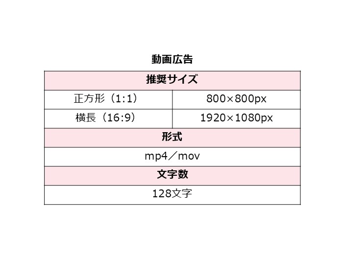 | 規格 | ■画像広告 ・推奨サイズ └正方形(1:1)800×800px └横長(1.91:1)800×418px ・形式 jpg/png ・文字数 128文字 ■動画広告 ・推奨サイズ └正方形(1:1)800×800px └横長(16:9)1920×1080px ・形式 mp4/mov ・文字数 128文字 ■カルーセル広告 ・推奨サイズ └画像正方形(1:1)800×800px └画像横長(1.91:1)800×418px └動画正方形(1:1)800×800px └動画横長(16:9)800×450px ・形式 静止画:jpg/png 映像:mp4/movなど ※カルーセル内で画像と動画の両方を使用する場合は、正方形(1:1)のみ可能。 |